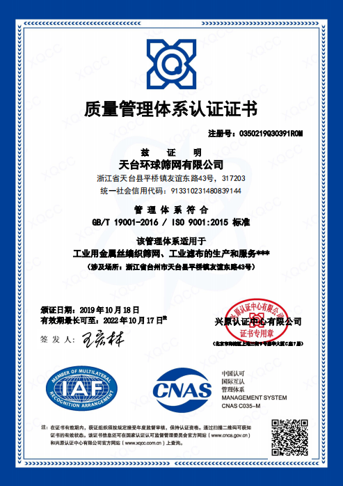 天臺環球篩網有限公司,成立于1995年,座落在東海之濱美麗的天臺山腳下,注冊資金500萬人民幣,公司已通過ISO9001:2015國際質量體系認證。經過環球人的不斷努力,目前公司已擁有標準廠房10,000平方米,各種篩網設備近100臺,員工100余人,其中高中級科研及管理人員10人,公司產品主要有:不銹鋼網,銅網,電焊網,電焊網片,軋花網,不銹鋼延伸產品,單復絲濾布,濾布袋,壓濾機袋等。